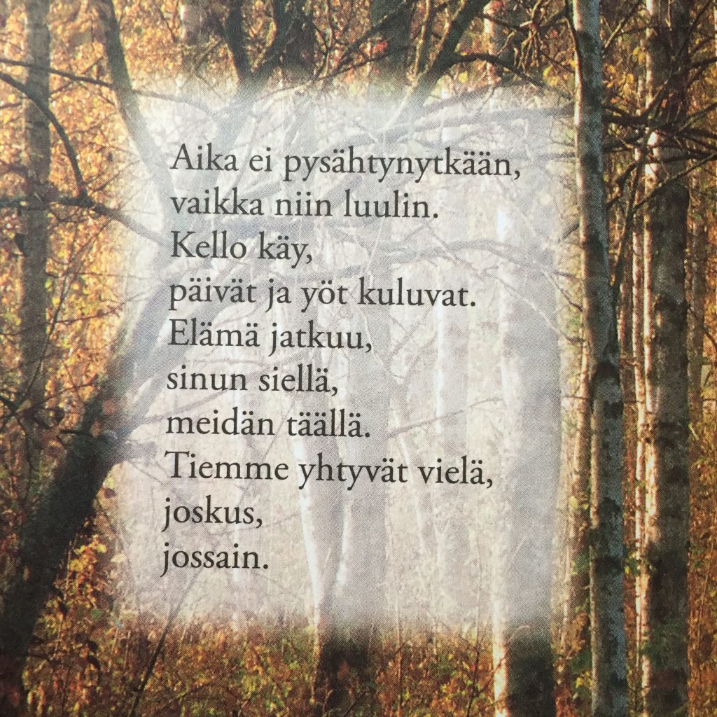 Läheisen tai läheisten kuolemista toipuminen ottaa oman aikansa ja se muuttaa muotoaan koko ajan. En tiennyt 2 vuotta sitten mitä minulla on edessä, takana, tulossa. Mutta tähän oli vain pakko hypätä, pakko pärjätä, pakko hyväksyä, pakko suoriutua eteenpäin.